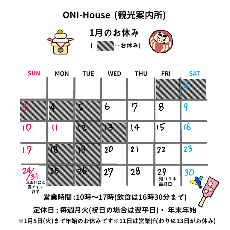 観光案内所ONI-Houseの年末年始及び1月のお休みです。