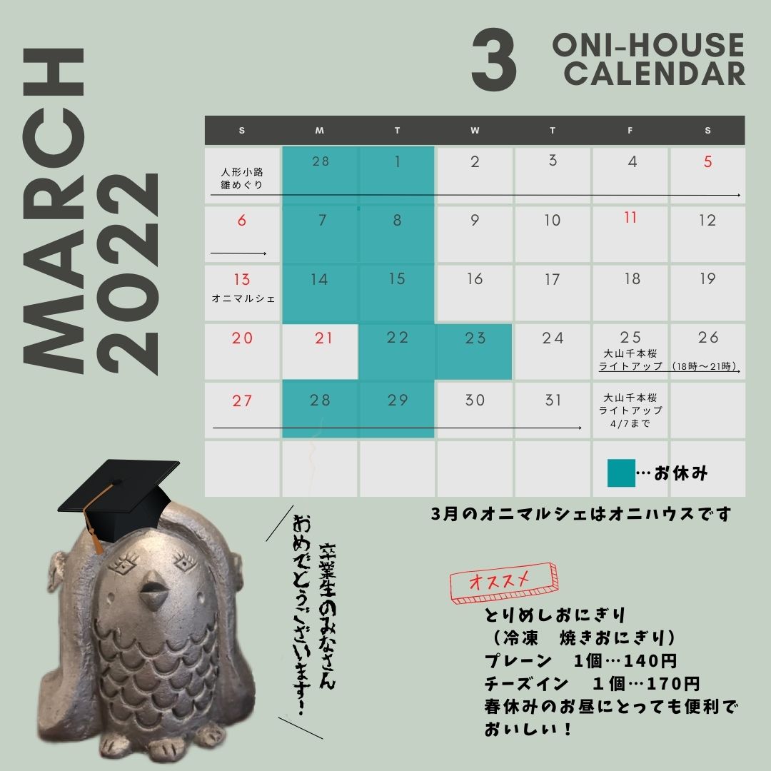 観光案内所ONI-House 3月のカレンダーです。