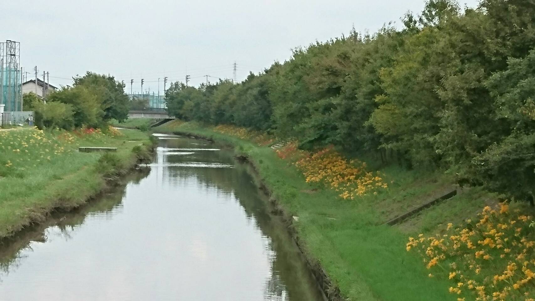 稗田川に架かる「小橋」「法響橋」「中学橋」「吉野橋」あたりで彼岸花が見られます。