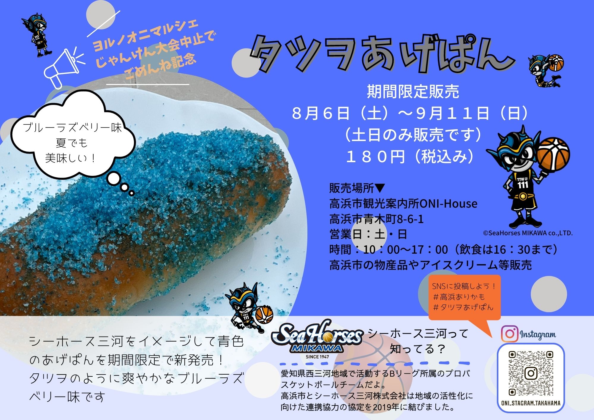 残念ながら中止とさせていただきましたヨルノオニマルシェにて、シーホース三河の所属タレント「タツヲ」とじゃんけん大会で盛り上がる予定だった皆さまと、そうでない皆さまへのお詫びといたしましてシーホース三河をイメージした青色のあげぱんを販売します。